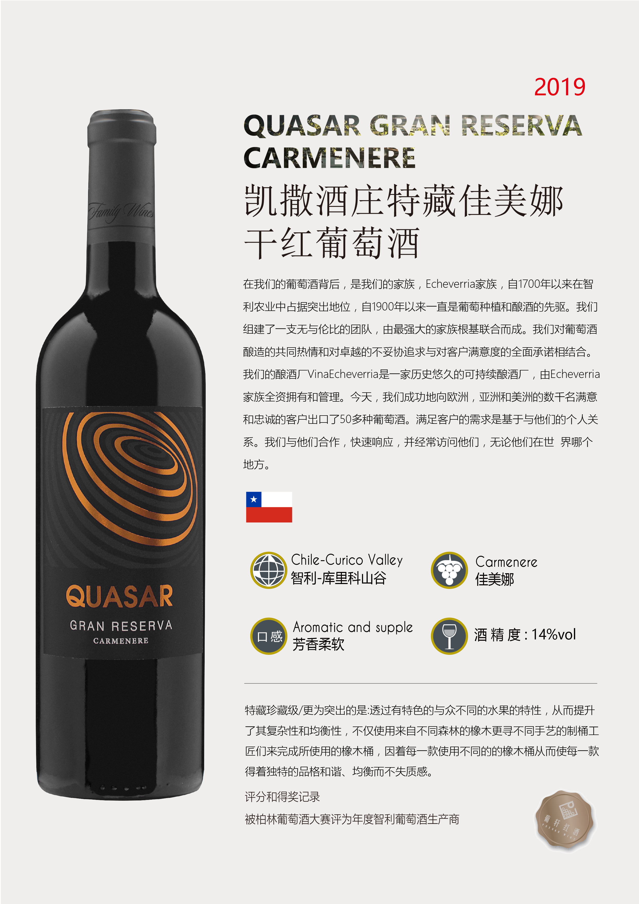 葡萄品種 | 佳美娜(Carmenere) | 酒精度 | 14% | 酒體 | 圓潤 |