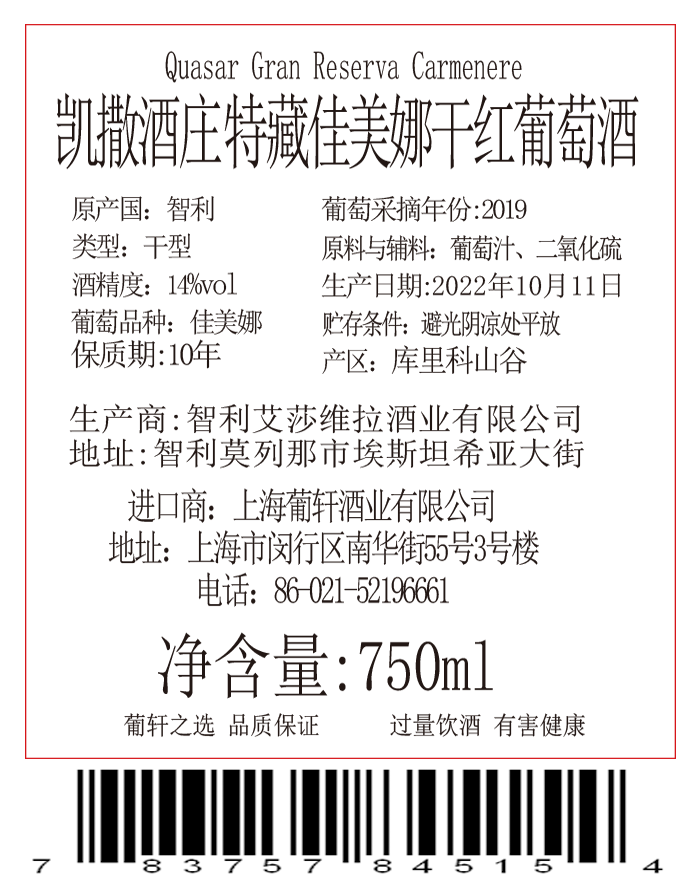 凱撒酒莊限量版赤霞珠干紅葡萄酒3L