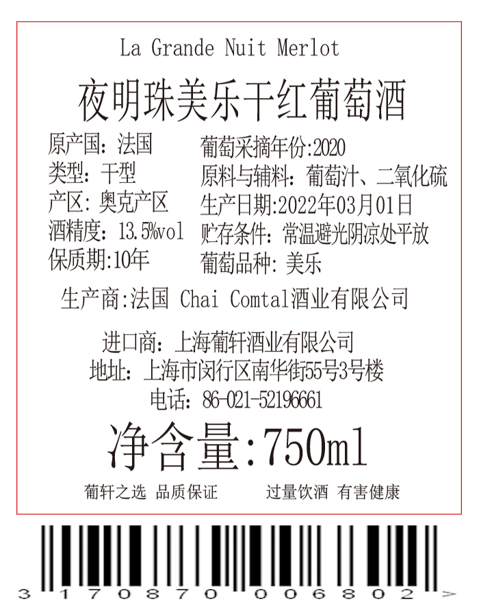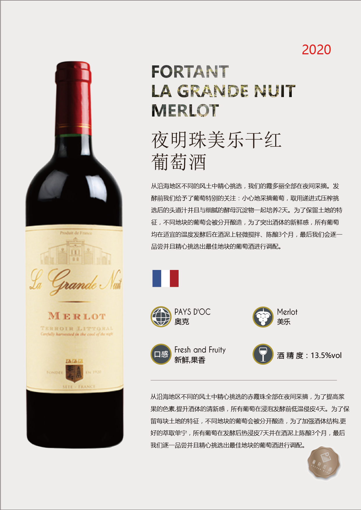 葡萄品種 | 美樂 | 酒精度 | 13.5% | 酒體 | 飽滿 |