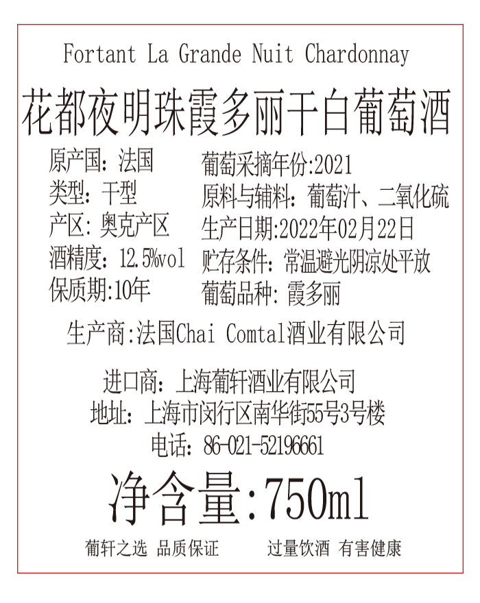 酒體顏色 | 檸檬黃色 | 包裝規格 | 6/紙箱 | 口感 | 新鮮果香 |