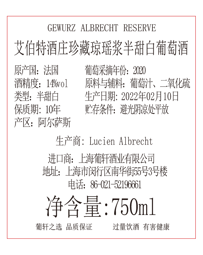 葡萄品種 | 瓊瑤漿GEWURZTRAMINER | 酒精度 | 14% | 酒體 | 輕盈 |