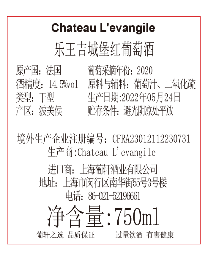 酒體顏色 | 寶石紅色 | 包裝規格 | 6/木箱 | 口感 | 芳香強壯 |
