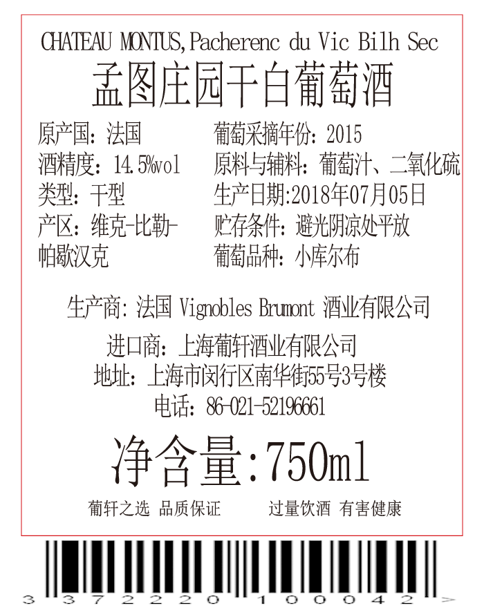 葡萄品種 | 小庫爾布、小芒森 | 酒精度 | 14.5% | 酒體 | 中低 |